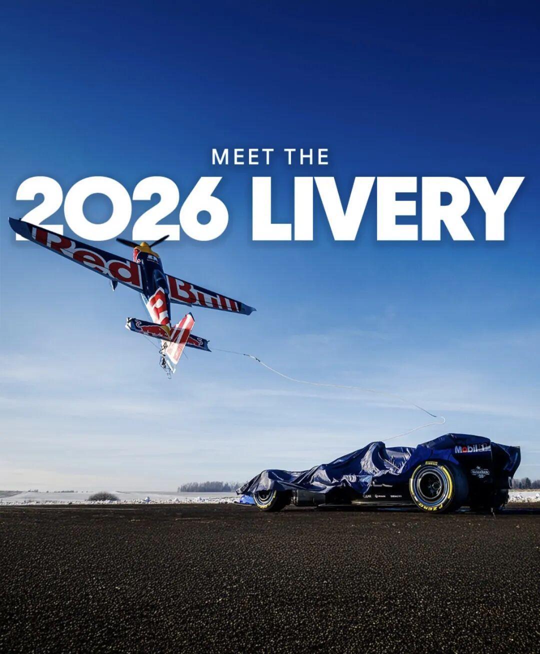 2026红牛F1车队的新款RB22赛车正式揭晓,正常人都知道正常红牛肯定不会“正常”搞个发布会。于是大家看到一辆车蒙着布,停在那里,突然,斜刺里飞来一架小飞机,尾钩挂住蒙布,飞机一个大角度爬升,新车亮相。